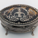 London c.1800. Beautiful and authentic Georgian-period English sterling silver–mounted tortoiseshell box, dating to circa 1795–1810. The oval box is raised on four silver feet and features a finely engraved neoclassical urn with floral swags on the lid, a classic motif of the late 18th / early 19th century. Genuine tortoise shell panels. sterling silver mounts and feet. 3” wide. Lined interior. Marks: Lion passant sterling silver, Leopard’s head – London assay office Duty mark (King’s head).